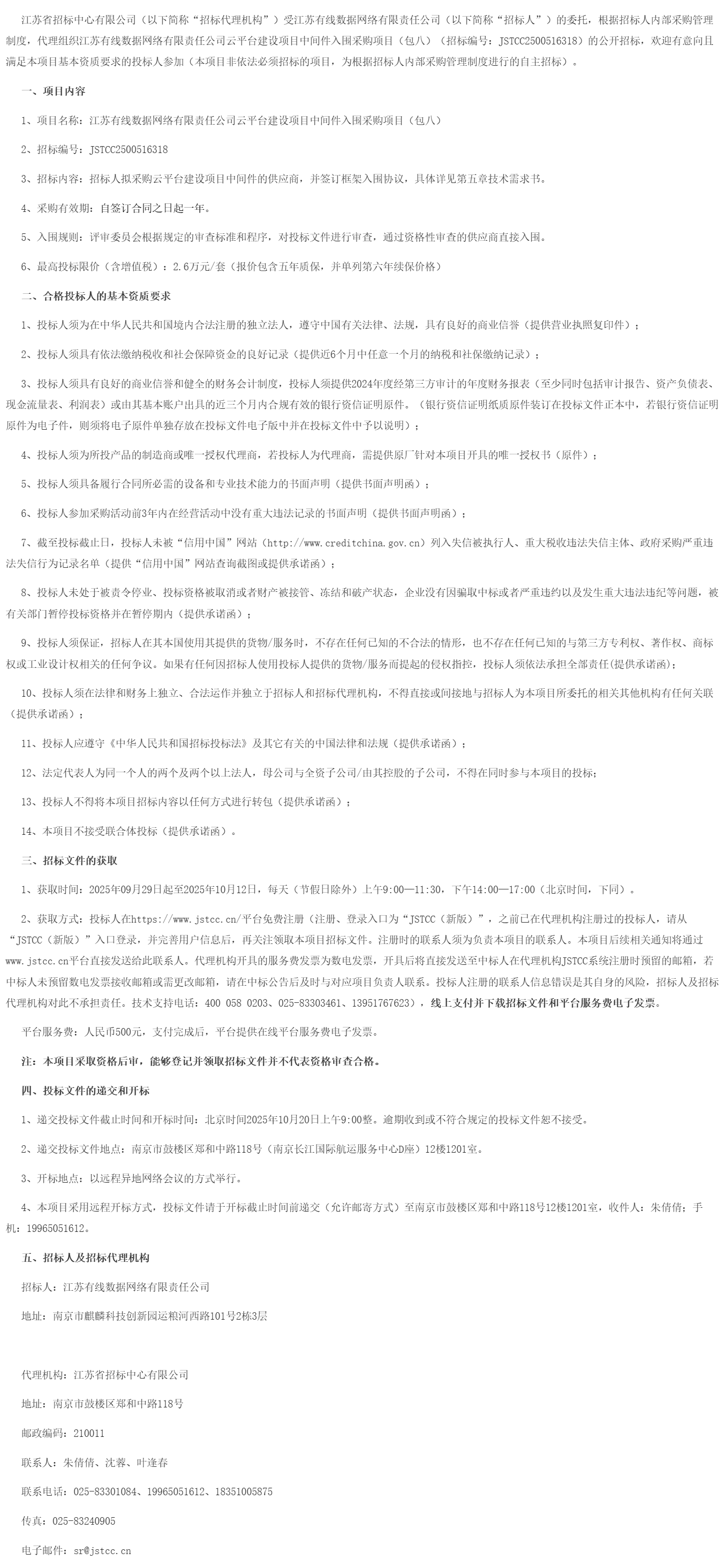 江苏省招标中心有限公司(以下简称“招标代理机构”)受江苏有线数据网络有限责任公司(以下简称“招标人”)的委托,根据招标人内部采购管理制度,代理组织江苏有线数据网络有限责任公司云平台建设项目中间件入围采购项目(包八)(招标编号:JSTCC2500516318)的公开招标,欢迎有意向且满足本项目基本资质要求的投标人参加(本项目非依法必须招标的项目,为根据招标人内部采购管理制度进行的自主招标)。