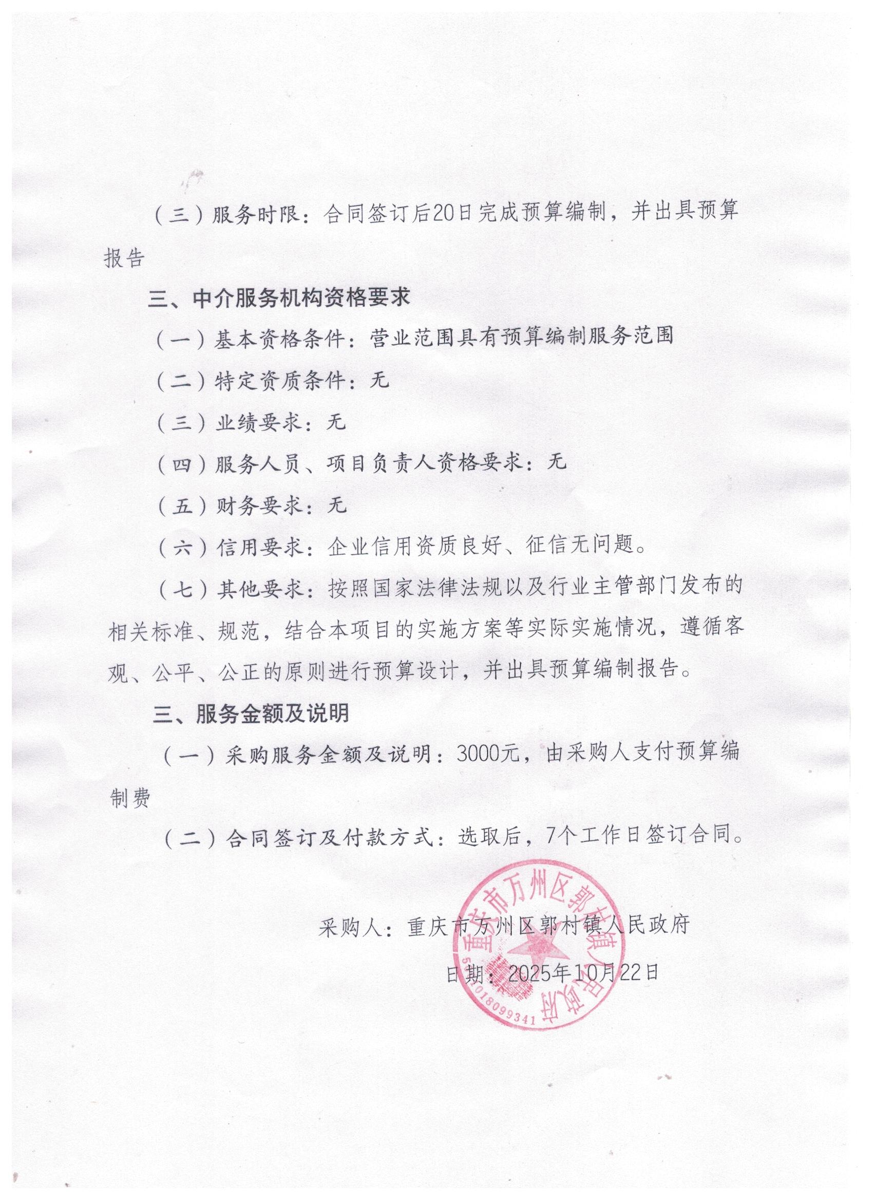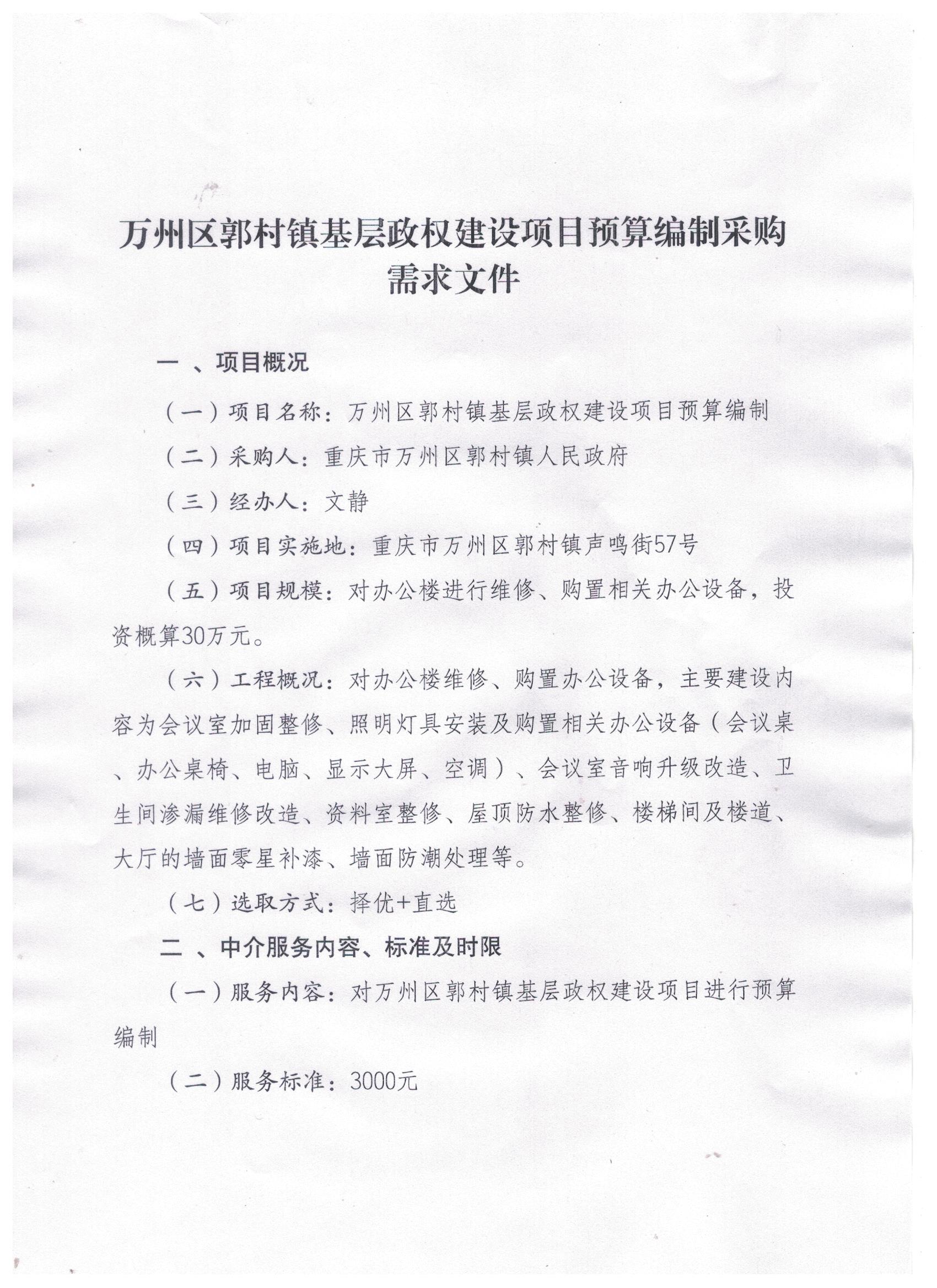 | 服务内容 | 对万州区郭村镇基层政权建设项目预算编制 |
