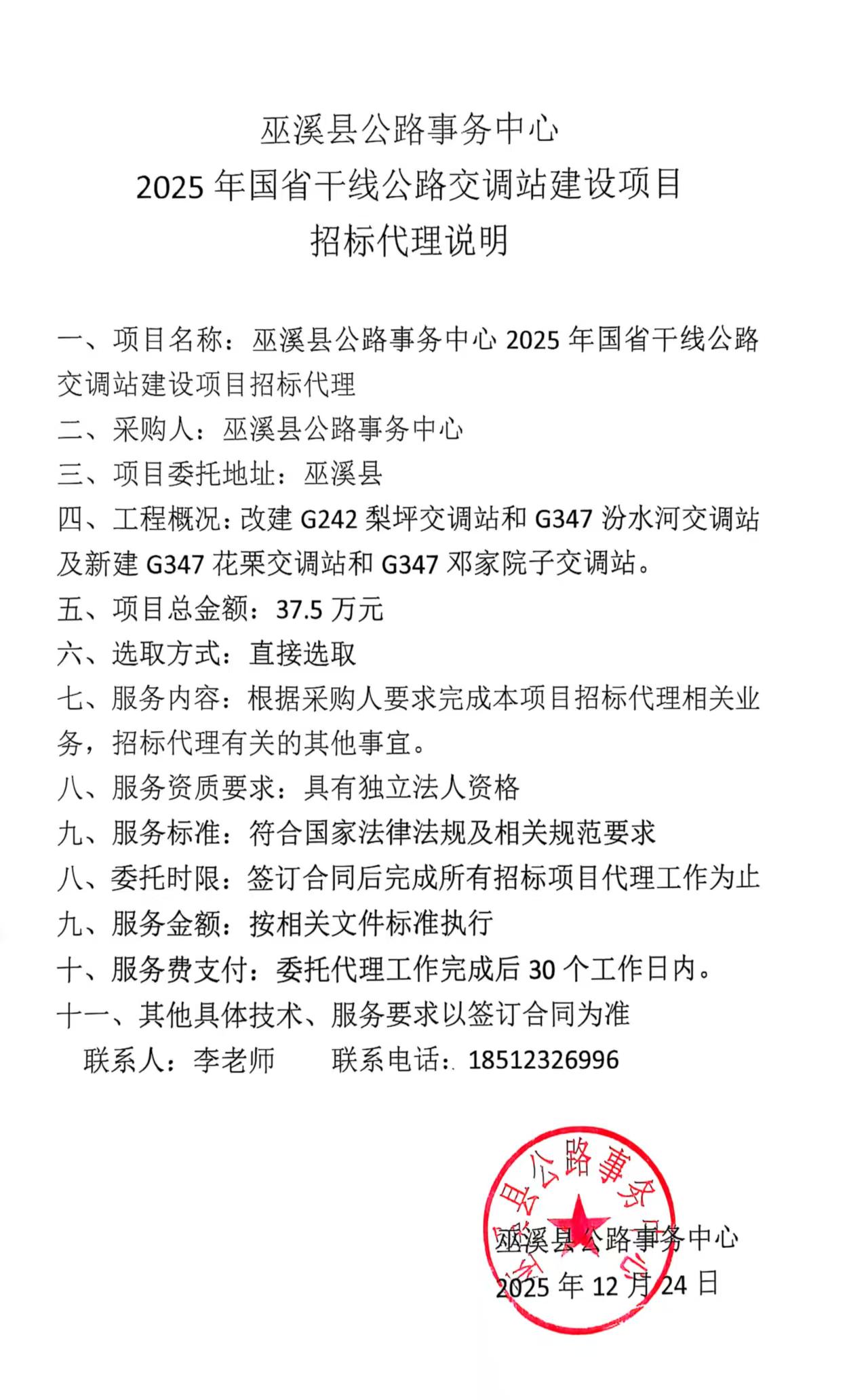 | 服务内容 | 完成巫溪县公路事务中心2025年国省干线公路交调站建设项目招标代理相关工作 |