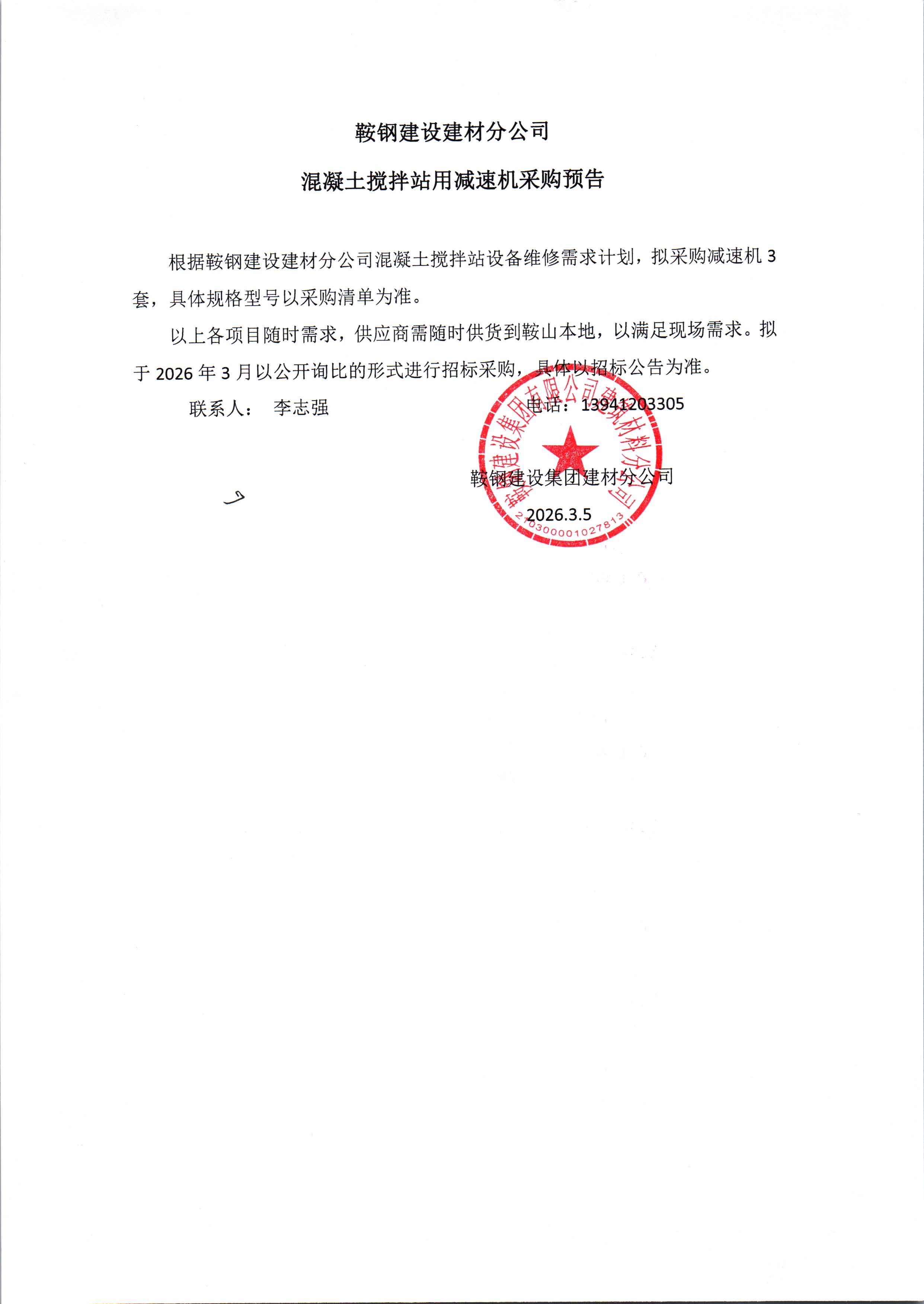 1 | 鞍钢建设建材分公司混凝土搅拌站用减速机采购 | 建材分公司混凝土作业区设备日常维修 | 2026.3 |