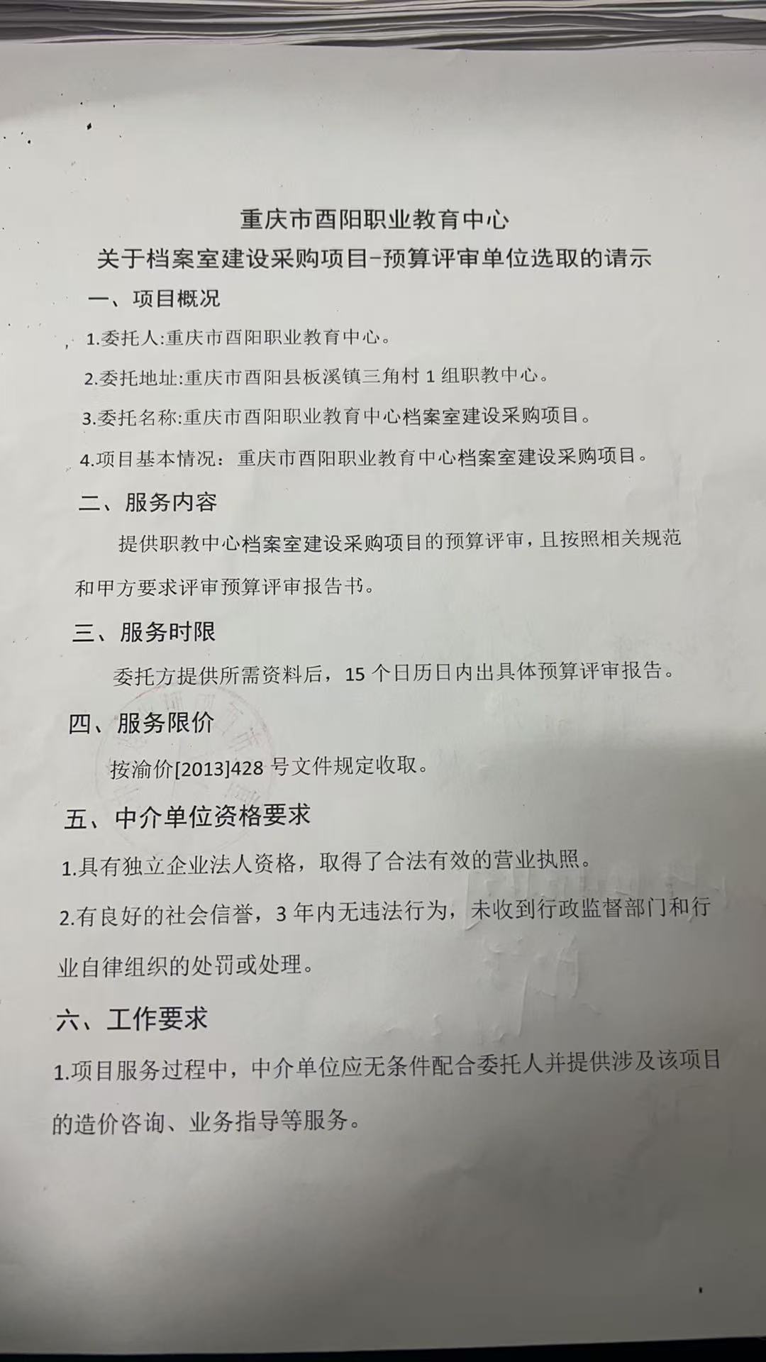 | 服务内容 | 重庆市酉阳职业教育中心关于档案室建设采购项-预算评审 |